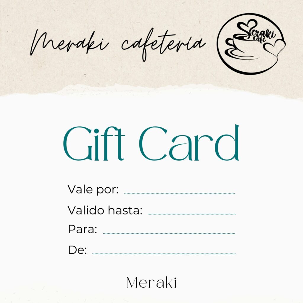 ¡Sorprende a tus seres queridos con una gift card de Meraki Café! Perfecta para cumpleaños, aniversarios o simplemente para regalar a un amigo. ¡Un detalle delicioso que siempre se aprecia!